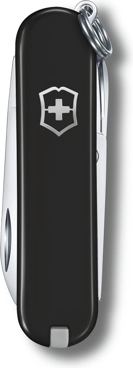 - Met 7 RVS functies: een klein mes, pincet, kleine schaar, nagelvijl, 2,5mm schroevendraaier, sleutelring en herbruikbare tandenstoker (kunststof).