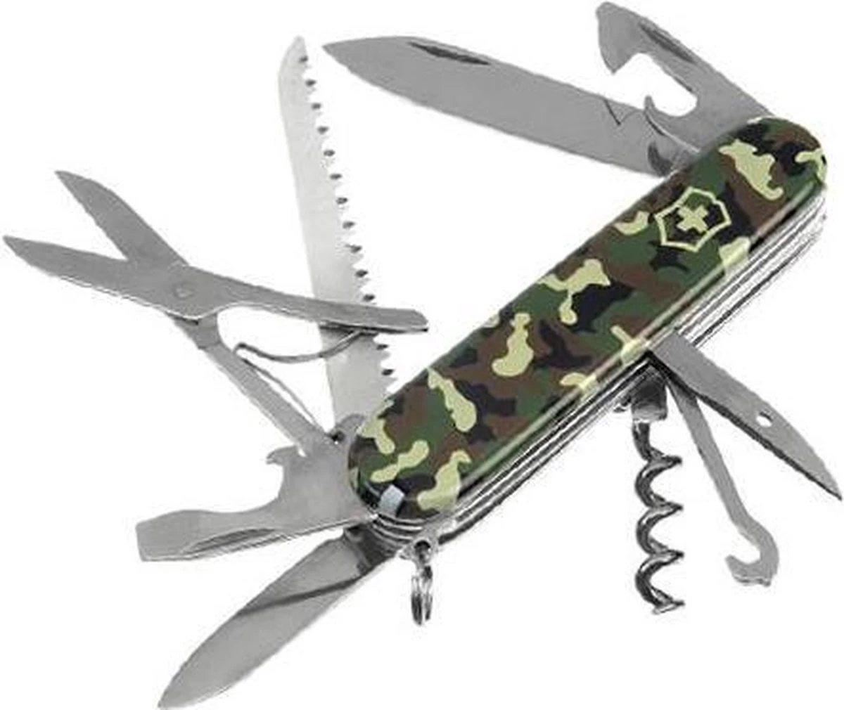 Victorinox Huntsman Zakmes camouflage 15 functies Met de toevoeging van een schaar en een houtzaag kunt u overal in knippen en zagen. Wanneer je in de wildernis bent is een Huntsman in de broekzak erg prettig. Kenmerken – Groot lemmet – Klein lemmet – Blikopener – Schroevendraaier 3 mm – Flesopener – Schroevendraaier 5 mm – Draad stripper – Priem – kurkentrekker – Schaar – Houtzaag – Multifunctionele haak – Tandenstoker – Pincet – Sleutelhanger Gewicht 97 gram Schaalmateriaal ABS/Celidor Grootte 91 mm
