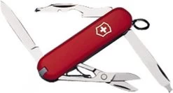 Victorinox Original Swiss Army zakmes ‘Rambler’ met gladde rode beschaling. Alle onderdelen zijn van roestvrij staal. Dit zakmes van superieure Zwitserse kwaliteit heeft de volgende 10 functies: groot mes, schaar, nagelvijl met schroevendraaier, flesopener met Phillips kruiskopschroevendraaier en draadstripper, sleutelring, pincet en tandenstoker.