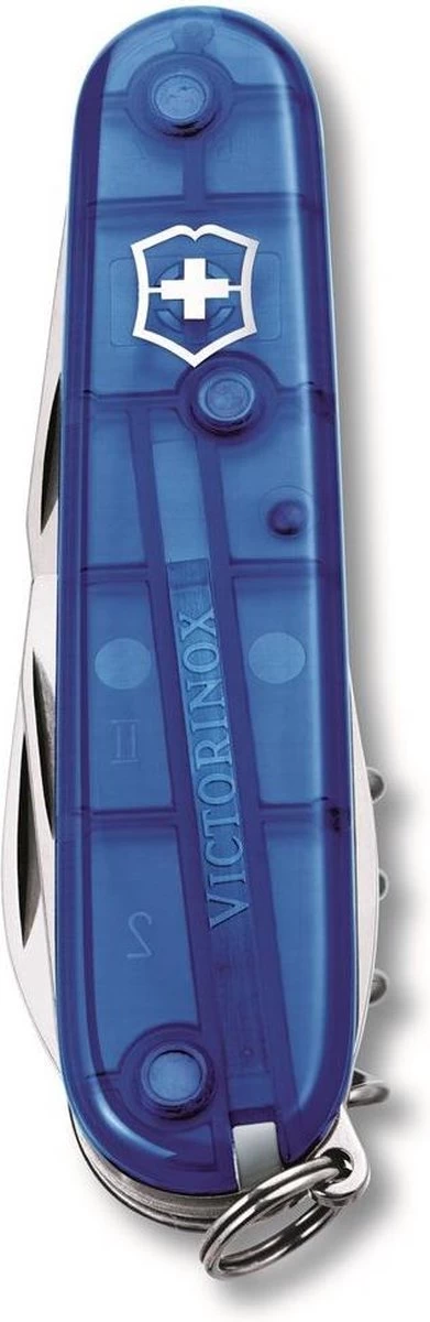 Victorinox Original Swiss Army zakmes ‘Climber’ met gladde transparant blauwe beschaling. Alle onderdelen zijn van roestvrij staal. Dit zakmes van superieure Zwitserse kwaliteit heeft de volgende 14 functies: groot mes, klein mes, schaar, multifunctionele haak, kurkentrekker, blikopener met kleine schroevendraaier (ook voor kruiskopschroeven), flesopener met schroevendraaier en draadstripper, boorpriem, sleutelring, pincet en tandenstoker.
