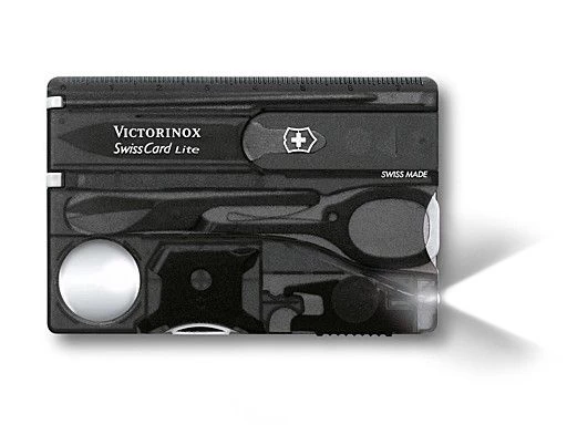 Victorinox SwissCard Lite – Multitool van transparant zwart plastic (onyx) in creditkaart model. Afmetingen 82 x 54 x 4 mm. Met 12 functies: zeer fel LED lampje, briefopener/lemmet, schaar, loep, schroevendraaier 3 mm, schroevendraaier 5 mm, Phillips schroevendraaier 00-0, Phillips schroevendraaier 1-2, roestvrij stalen pin, pincet, ballpoint, liniaal (cm) en linaal (inches). Gemaakt met Zwitserse precisie en vakkundigheid. Levenslange garantie. Levering op blister.