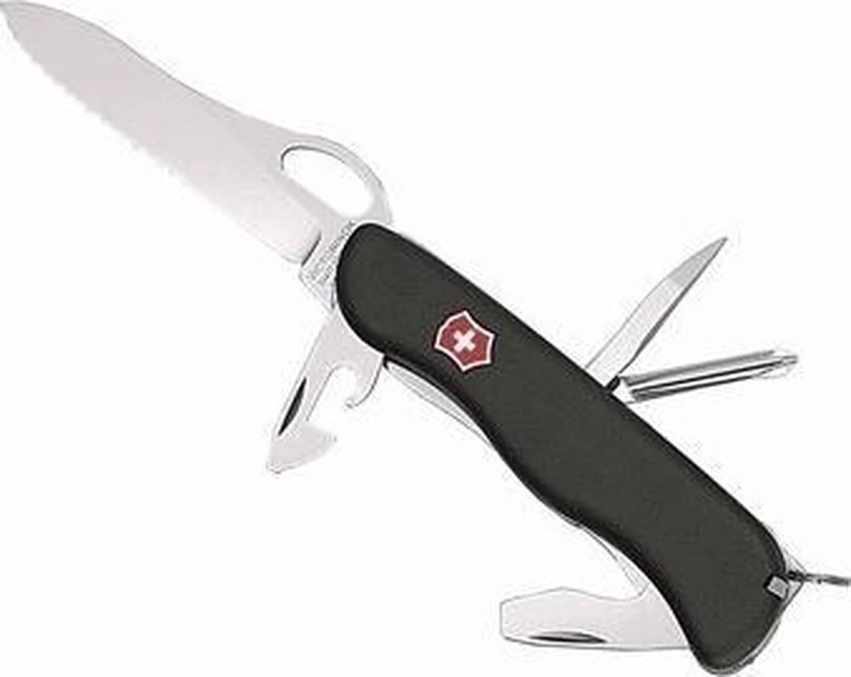 Victorinox Original Swiss Army zakmes āTrailmasterā met gladde zwarte beschaling. Alle onderdelen zijn van roestvrij staal. Dit zakmes van superieure Zwitserse kwaliteit heeft de volgende 12 functies: met ƩƩn hand vergrendelbaar mes, Philips kruiskopschroevendraaier, blikopener met kleine schroevendraaier, flesopener met schroevendraaier en draadstripper, priem, sleutelring, houtzaag, pincet en tandenstoker. Victorinox: Victorinox staat voor meer dan een eeuw traditie en ervaring. In 1884 begon de messensmid Karl Elsener een eigen messenmakerij in het dorpje Ibach in het hart van Zwitserland. Enkele jaren later ontwierp hij āThe Original Swiss Army Knifeā, dat inmiddels wereldwijd symbool staat voor kwaliteit, functionaliteit en Zwitsers innovatief talent. Victorinox geeft levenslang garantie op alle materiaal en constructiefouten. Betrouwbaarheid en perfectie tot in detail: een Victorinox is een echte compagnon voor het leven. Kenmerken: ⢠Superieure Zwitserse kwaliteit ⢠Alle onderdelen van roestvrij staal ⢠Gladde zwarte beschaling ⢠12 functies waaronder een houtzaag ⢠Lengte gesloten 111 mm ⢠In doosje ⢠Levenslange garantie