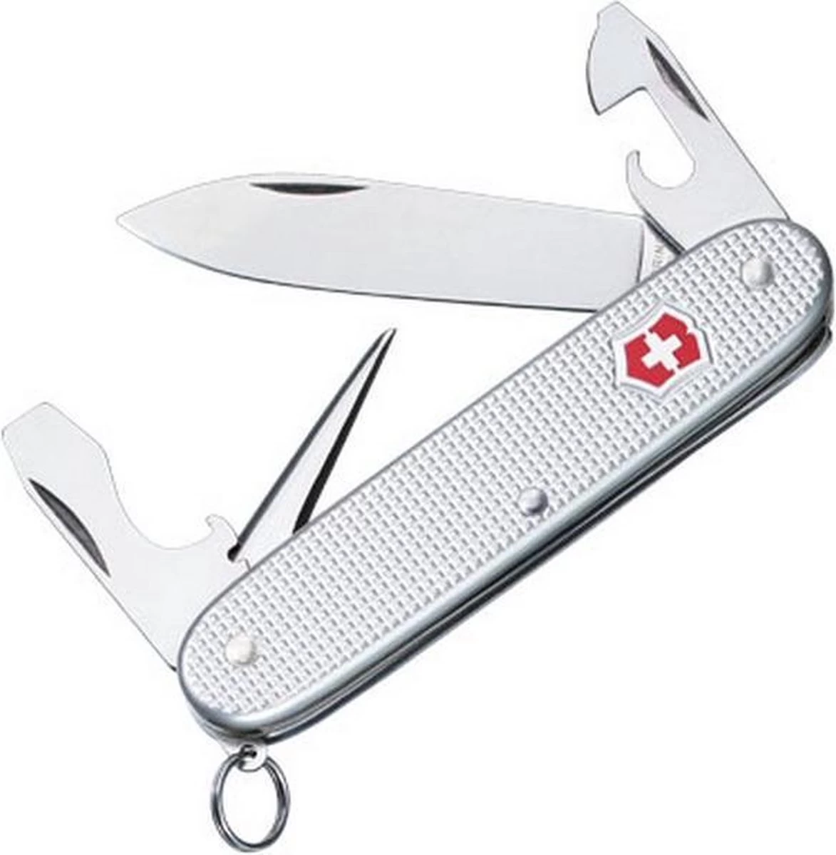Zakmes ‘Pioneer’ van Victorinox met geribbelde Alox zilveren beschaling. Alle onderdelen zijn van roestvrij staal. Dit zakmes van superieure Zwitserse kwaliteit heeft 8 functies: groot mes, priem, flesopener met kleine schroevendraaier, blikopener met schroevendraaier en draadstripper, sleutelring. Ideaal om altijd op zak te hebben. Levenslange garantie.